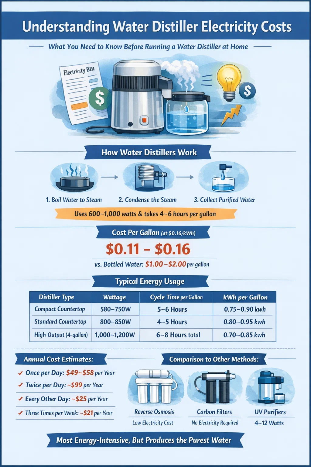 Så det ærlige svar er dette: Vanddestillere er ikke energieffektive apparater, men for de fleste husholdninger er de helt overkommelige at køre. Nøglen er at forstå præcis, hvad der sker elektrisk og at træffe smarte valg om, hvornår og hvor ofte du betjener din.