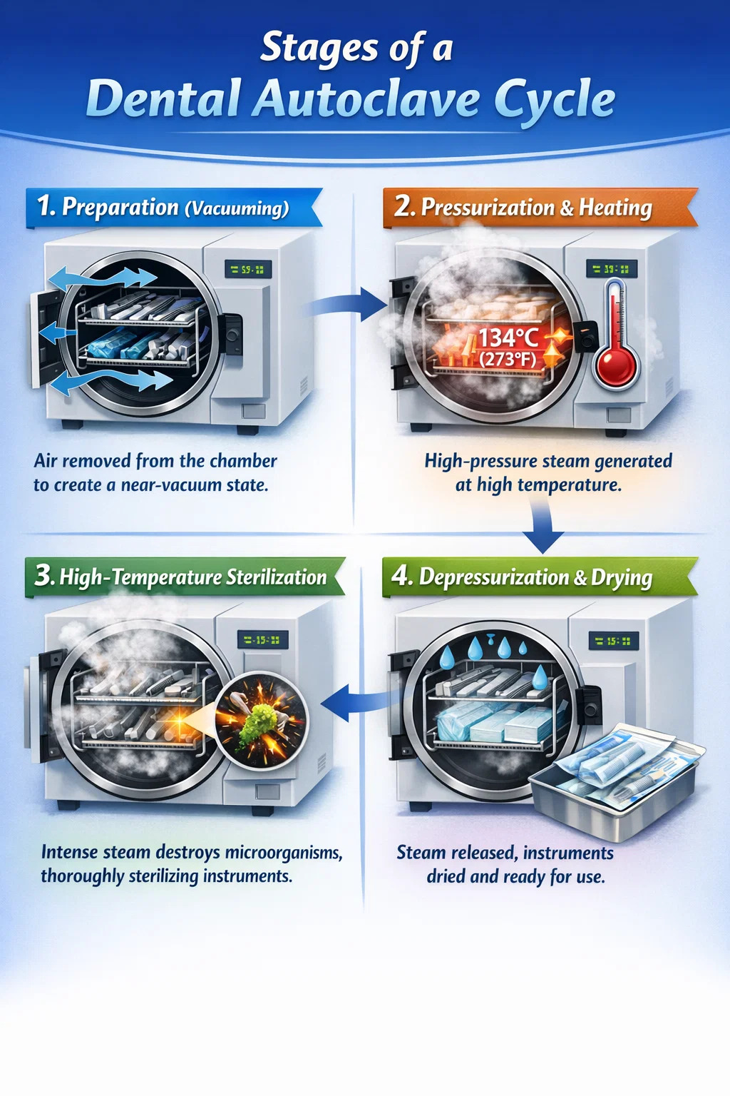 Tørrefunktion: For at forhindre sekundær kontaminering forårsaget af våde instrumenter ved fjernelse, aktiverer mange dentale autoklaver vakuumpumpen igen for at fjerne eventuel resterende fugt. Afkøling og fjernelse: Endelig vender trykket inde i kammeret tilbage til samme niveau som ydersiden, og når temperaturen falder lidt, kan lægerne hente pakker med tørre, rene instrumenter.