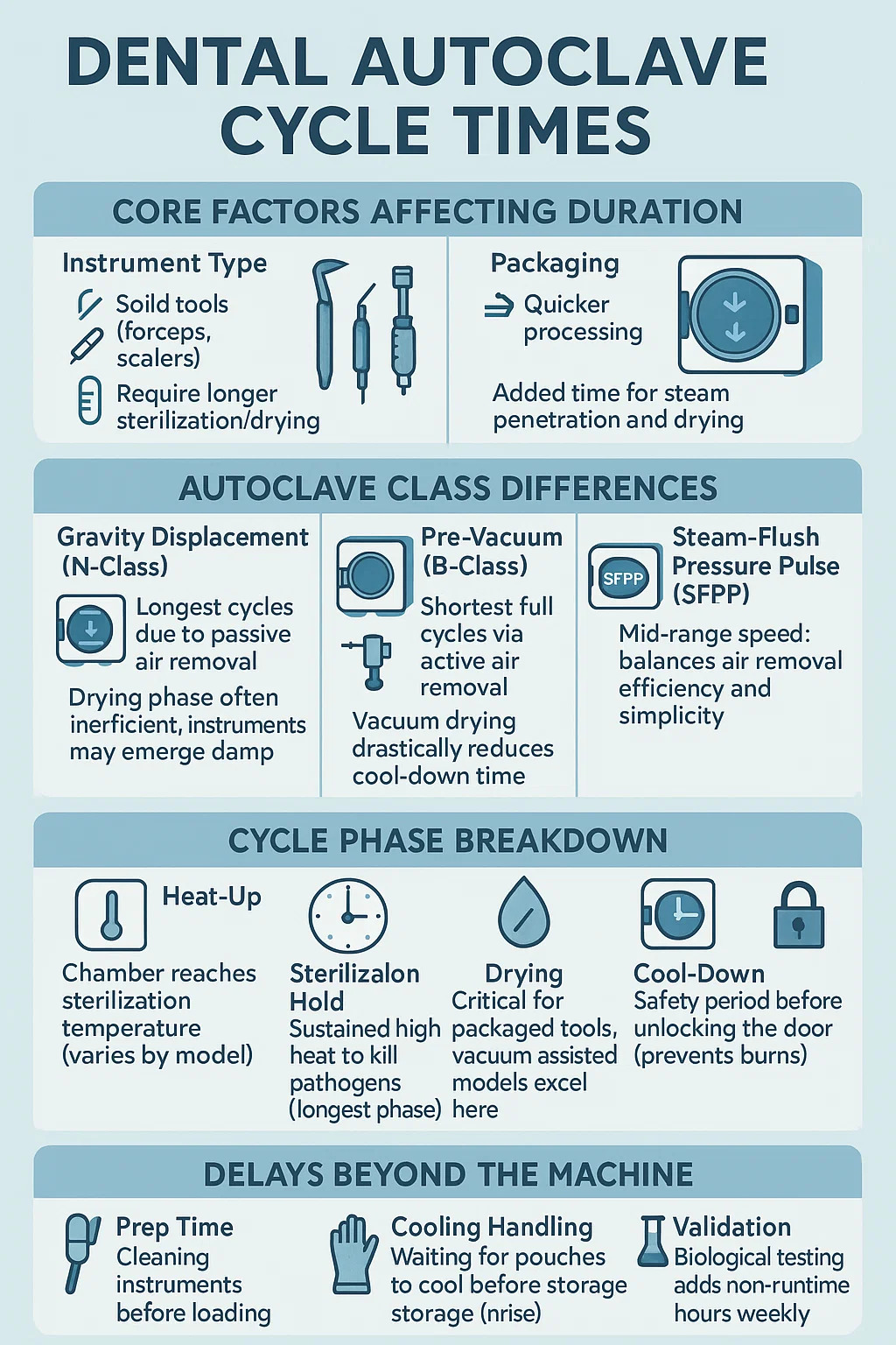 Her er en oversigt over dental autoklave cyklustider med fokus på praktiske faktorer: