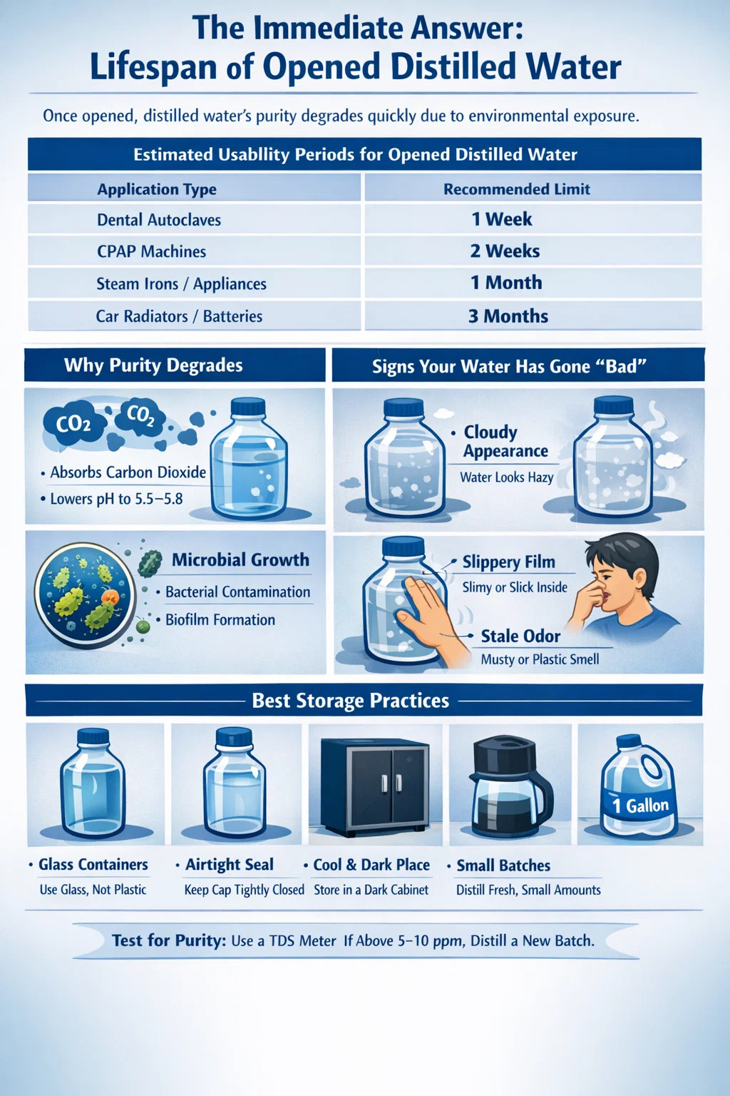 Når først en flaske destilleret vand er åbnet, begynder dens højrenhedsstatus at blive nedbrudt på grund af eksponering for miljøet. Til medicinske eller dentale formål - såsom brug i en autoklave - holder åbnet destilleret vand normalt 7 til 14 dage hvis de opbevares korrekt på et køligt, mørkt sted. Til husholdningsapparater som dampstrygejern eller luftfugtere kan det forblive brugbart til op til 30 dage . Selvom vandet ikke "forkæler" på samme måde som mad gør, absorberer det aggressivt kuldioxid og luftbårne partikler, hvilket kan ændre dets pH-niveau og introducere mikroskopiske forurenende stoffer, der udelukker fordelene ved at bruge en vanddestilleri .