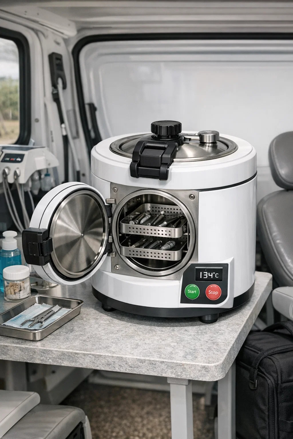 En bærbar dental autoklave er en mindre, lettere, mobil autoklave. Hvis en stor autoklave er som et stort køleskab derhjemme, så er den bærbare model som et lille, bærbart køleskab, der nemt kan flyttes rundt, specielt designet til scenarier med begrænset plads eller kræver mobilt arbejde.
