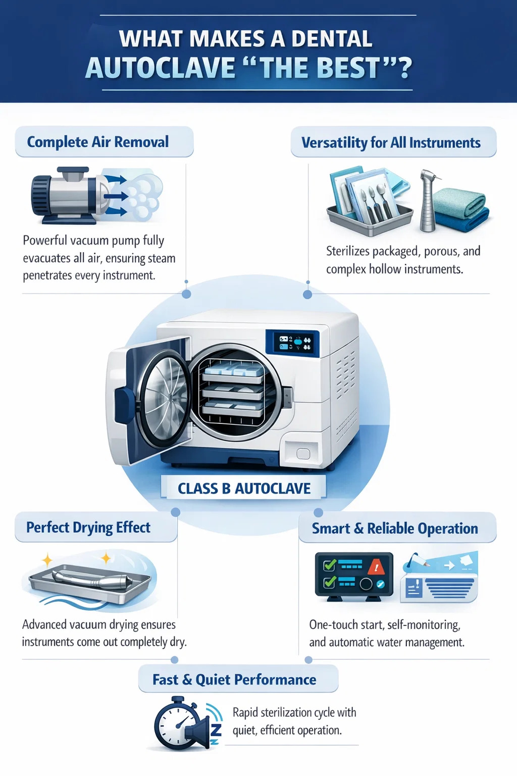 For tandklinikker er der ikke én enkelt "verdens bedste" model, men det generelt accepterede bedste valg refererer normalt til Klasse B tandautoklaver der kan håndtere forskellige komplekse situationer og tilbyde den mest stabile ydeevne.