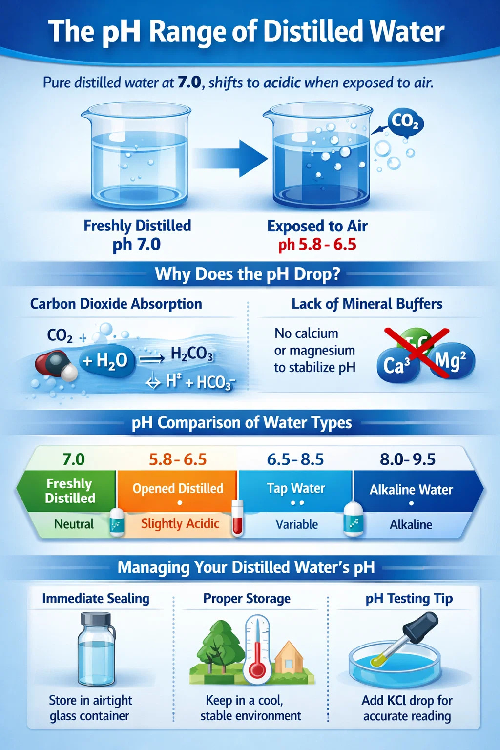 Det teoretiske pH-niveau for rent destilleret vand i det øjeblik, det forlader en vanddestilleri er en neutral 7.0 . Men i praktiske laboratorie- og kliniske omgivelser måler pH-værdien af destilleret vand typisk mellem 5.8 og 6.9 . Dette skift mod surhed sker næsten øjeblikkeligt ved eksponering for atmosfæren, da vandet absorberer kuldioxid fra luften. Selvom det forbliver sikkert til de fleste dentale og medicinske applikationer, er denne lille surhedsgrad en kritisk faktor for udstyrsvedligeholdelse og kemisk følsomhed.
