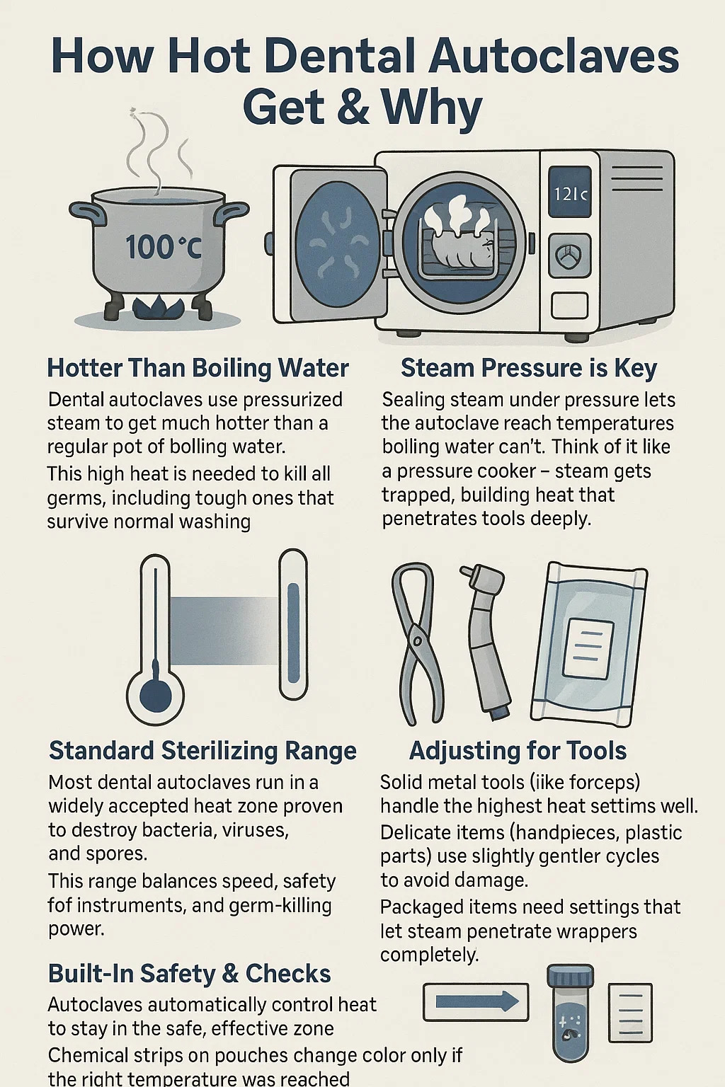 De fleste tandautoklaver køre i en bredt accepteret varmezone, der er bevist at ødelægge bakterier, vira og sporer.